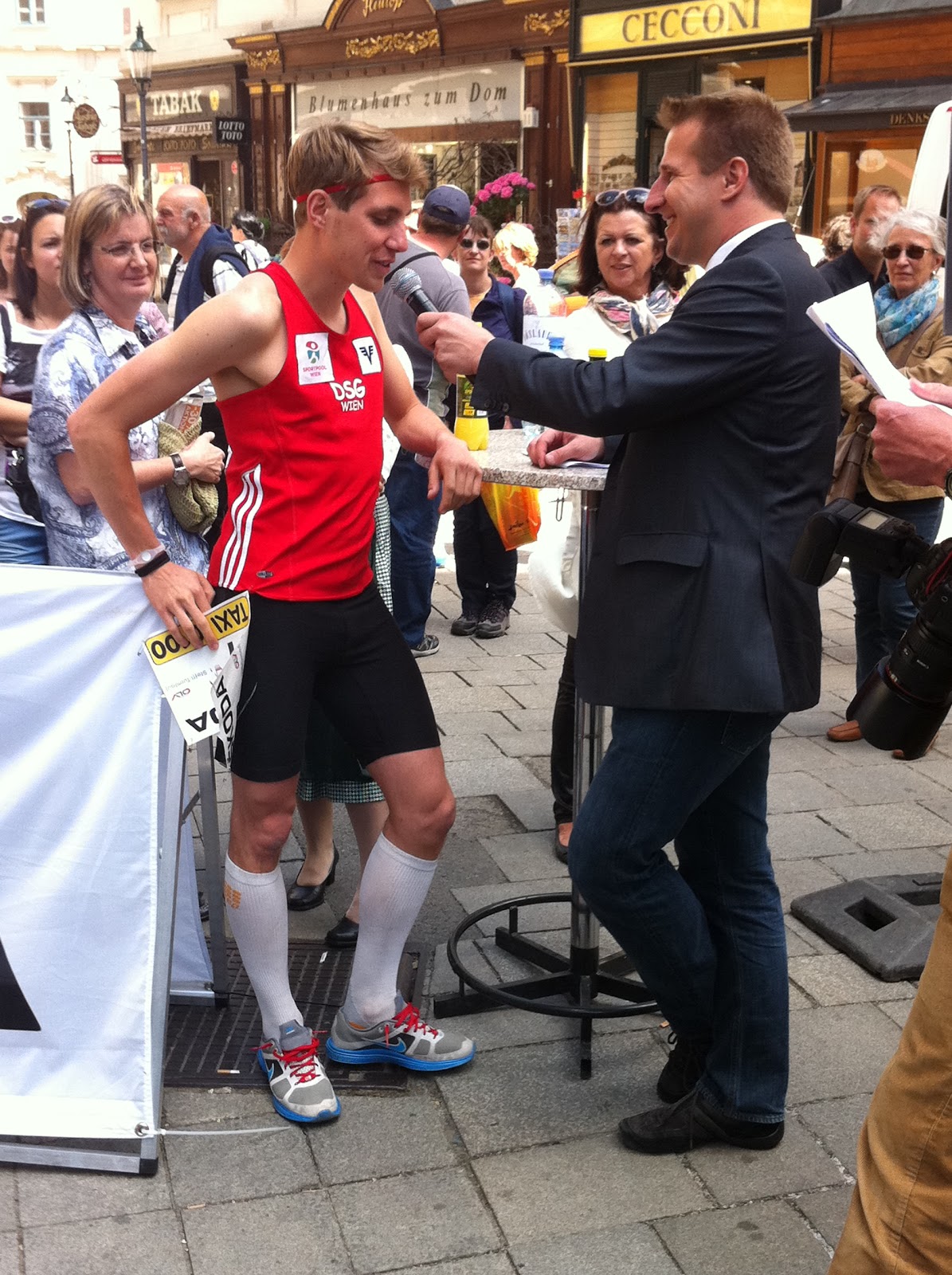 Mit Startnummer 7 ging ich ins Rennen und konnte mit einer Zeit von 1:40,25′ zwar immerhin 6 Sekunden schneller den Turm rauflaufen als Andrea Mayr in der Woche davor, für einen Platz auf dem Podium reichte es leider nicht ganz. Bis zu den letzten vier Startern lag ich noch auf der 1. Position – am Ende musste ich mich aber leider mit Rang 4 begnügen. Dennoch war es ein super Erlebnis mit großem Medieninteresse und vielen Zusehern, die außer den ersten 10 m auf dem Stephansplatz im Grunde genommen aber gar nichts wirklich sehen konnten 😉