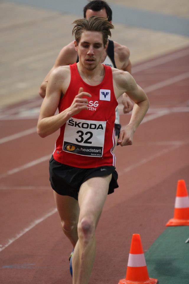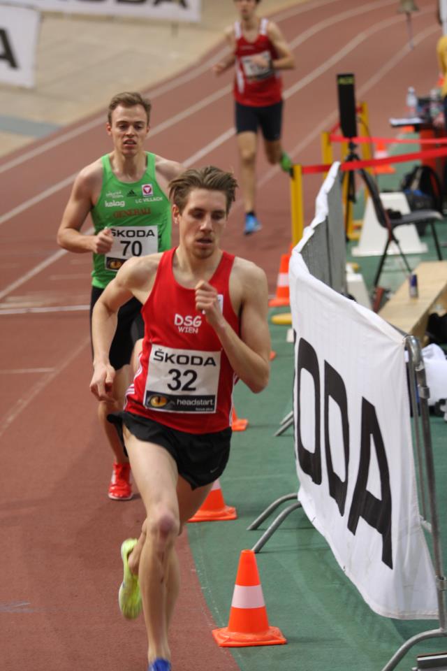 Am Start kam ich gut weg und die ersten 150m lief ich Seite an Seite mit Favorit Luki Pallitsch, ehe sich dann mein Laufkollege der letzten Wochen, David Schneider, an die Spitze setzte. Ich büßte auf der nächsten Runde noch zwei Positionen ein, als mich die beiden Tiroler Zierler und Lechleitner überholten. „Ruhig bleiben, schnell genug“ waren meine Gedanken. Dennoch ließ ich zu der vier Mann umfassenden Spitzengruppe ein Loch reißen und passierte die Kilometermarke in ~2:52′. Nun war ich auch schon nur mehr sechster und hängte mich bei Thomas Rossmann an. Am zweiten Kilometer liefen wir sehr konstant und ich ging nach zwei Runden wieder an Thomas vorbei und versuchte, das Tempo ein wenig zu forcieren. 2km liefen wir 5:45-46′ durch, der Abstand zu den beiden Tirolern wurde jedoch sukzessive kleiner. „Jetzt noch einmal mit Nachdruck am letzten Kilometer, sonst lass ich wieder eine Chance liegen“ – gesagt, gelaufen! Vier Runden vor Schluss war ich an den beiden dran und ging vorbei. Meine Beine waren noch immer sehr gut und so setzte ich mich sowohl von den beiden Tirolern wie auch von Thomas leicht ab. Auf der letzten Runde lief ich dem ungefährdeten drittem Platz entgegen und am Ende fehlten auch nur 1,7sec auf den Vizetitel und David! Sehr schade, hätte ich doch bloß … NEIN, scheiß drauf! Ich wollte die Medaille, jetzt hab ich sie! Kein langes Rumlamentieren! Die Zeit von 8:30,73min (letzter km in ~2:44′) ist keine 2sec langsamer als meine Freiluftbestleistung und satte 14sec schneller als meine bisherige HallenpB! Somit war Freude angesagt! Auch weil Kumpel Stephan mit 8:43′ eine spitzen Bestzeit hinknallte – und das wie ich auch mit nur einem spezifischen Training! Mörderisch wie’s bei uns in der Gruppe gerade lauft!