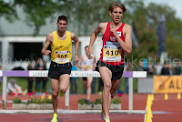 Gemeldet hatte ich meine alte Bestzeit aus dem Vorjahr von 5:56,3′ mit Zielzeit 5:48-49′ – somit war die Marschroute mit Runden knapp um die 70 Sekunden für mich klar. Der Regen setzte während unseres Rennens zum Glück aus, und auch der teilweise stark böige Wind hatte mit uns Hindernisläufern ein einsehen. Nach einem hektischen Start ging’s auf das erste Hindernis auf der Gegengeraden zu. Ganz schön viel los in einem fast 20 Mann starkem Feld und für mich ziemlich ungewohnt! Auf der Zielgeraden noch auf Bahn drei über den Bock, hatte ich nach rund 500m meine Position im Feld so um den zehnten Platz gefunden. Nach zwei Runden war ich dann voll angekommen im Rennen und konnte ein paar Plätze gut machen. Die 1000m passierte ich in circa 2:52′ – wobei Zwischenzeiten eher unbeachtet blieben.