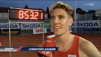 Das Rennen im größten Meisterschaftsfeld seit Jahren begann erwartungsgemäß. Christian setzte sich in der Startkurve an die Spitze und ich folgte ihm. Mit dabei an der Spitze war auch noch ein Läufer aus Slowenien, der eine Zeit unter neun Minuten anpeilte. Die erste Runde spulten wir in 69“ Sekunden ab – die Kilometermarke in etwa 2:56′. Zu dem Zeitpunkt war ich ständig an Christian dran und blieb auch hinter ihm, als er auf der Gegengeraden zwei Mal aufmachte. Etwa vier Runden vor Schluss übernahm ich dann die Führung und versuchte, Christian abzuschütteln. Das gelang mir trotz leichter Tempoverschärfungen zunächst noch nicht. Dennoch merkte ich gerade beim Wassergraben, dass ich besser über die Hindernisse kam. Auf den letzten drei Runden (2000m in ca. 5:57′) machte ich dann ernst. Beim Überrunden nach dem Wassergraben schlüpfte ich innen vorbei, während Christian den weiteren Weg hatte.